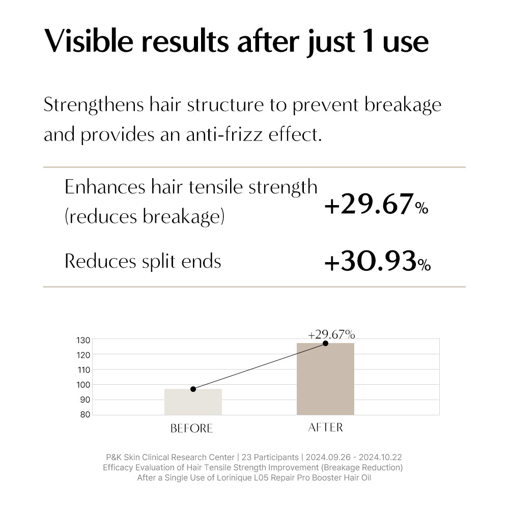 ✔ +29.67% improvement in hair tensile strength (reduced breakage)
